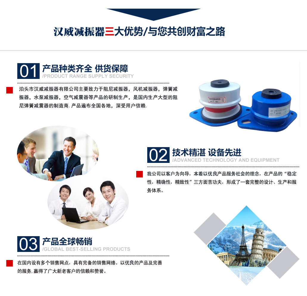 ?泊頭市漢威減振器有限公司主要致力于阻尼減振器,風(fēng)機(jī)減振器,彈簧減振器,水泵減振器,空氣減震器等產(chǎn)品的研制生產(chǎn),是國內(nèi)生產(chǎn)阻尼彈簧減震器的制造商,產(chǎn)品廣泛用于中央空調(diào)、通風(fēng)管道、鋼鐵、發(fā)電、石化、水泥和城市供熱等行業(yè)的各類管道和設(shè)備上,并在全國多地工程上得到應(yīng)用,業(yè)績遍布全國多地,深受用戶信賴. 公司主要減振器系列產(chǎn)品有:中央空調(diào)系列減振器、泵房系列減振器、管道系列減振器、風(fēng)機(jī)系列減振器、以及自行設(shè)計制作的系列隔振臺座。泊頭市漢威減震器科技有限公司擁有多名高素質(zhì)技術(shù)人員,擁有完善的阻尼彈簧減震器生產(chǎn)和檢驗專用設(shè)備,擁有硅橡膠自動擠出生產(chǎn)線,全自動彈簧機(jī)等設(shè)備。生產(chǎn)條件逐漸完善進(jìn)步,努力擴(kuò)大生產(chǎn)規(guī)模,提高泊頭市減震器科技有限公司的生產(chǎn)競爭力。 多年來漢威減振器以三誠作為公司的字號,旨在立足當(dāng)前......